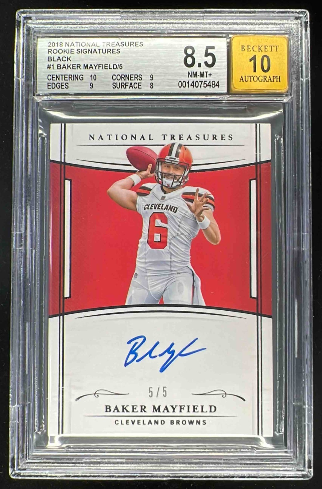 2018 National Treasures Rookie RPS Black #RSBM Baker Mayfield RC Auto /5 BGS 8.5