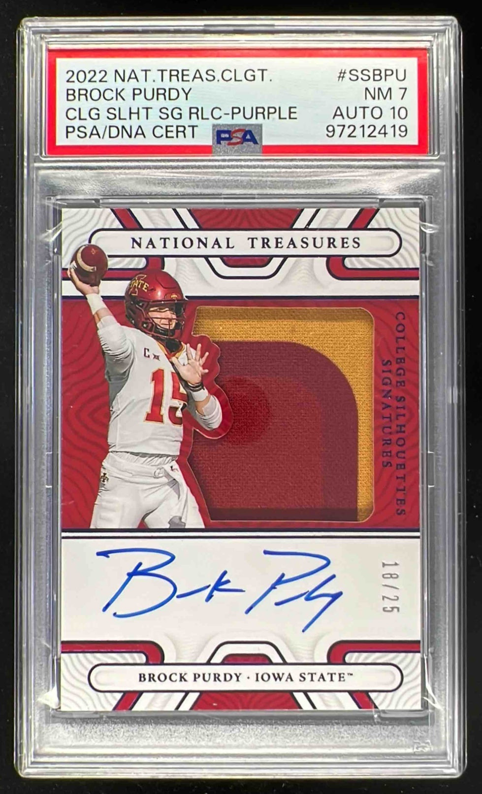 2022 National Treasures Collegiate Purple Brock Purdy RC Auto /25 PSA 7