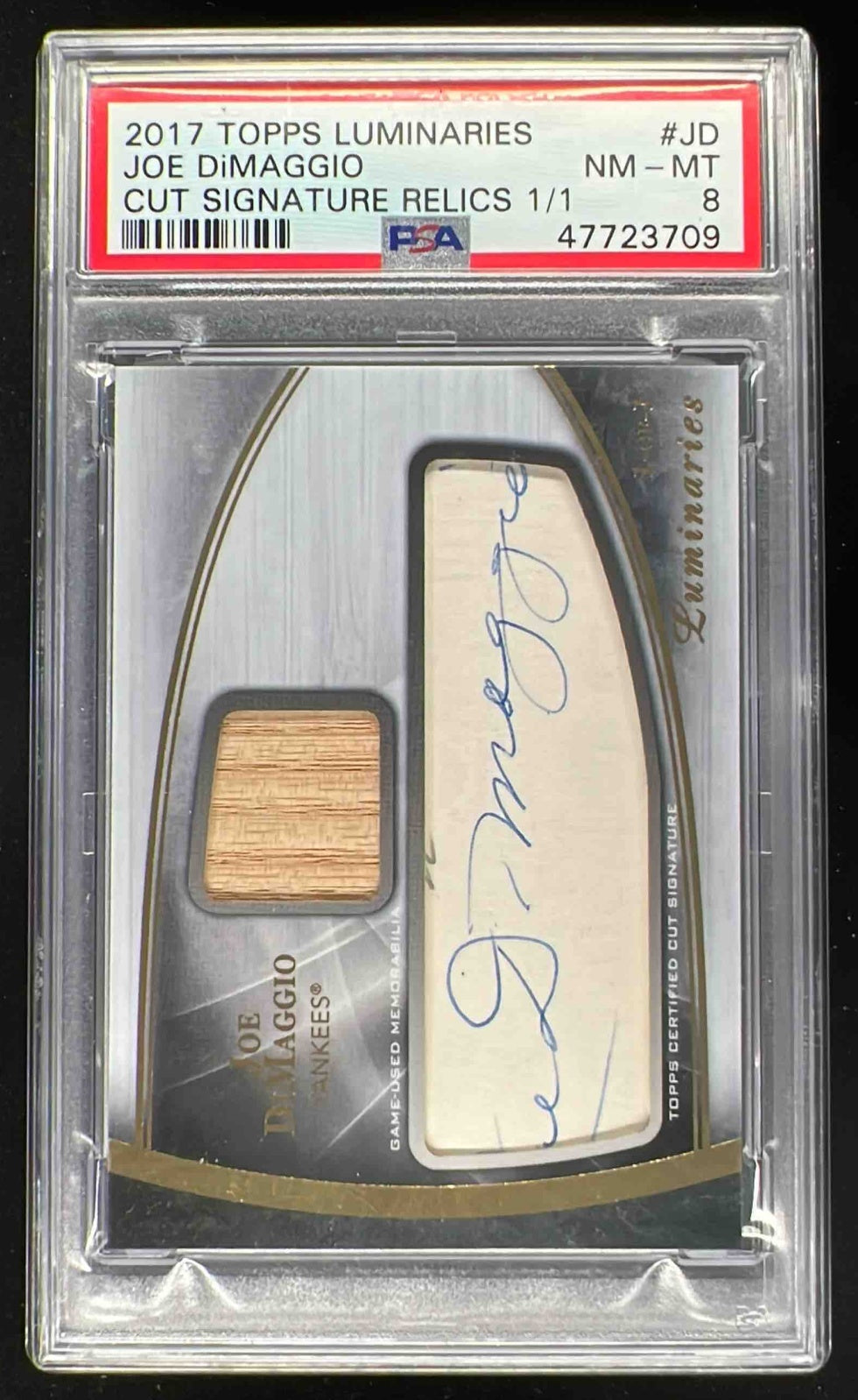 2017 Topps Luminaries Cut Signature Relics #CSR-JD Joe DiMaggio Auto 1/1 PSA 8