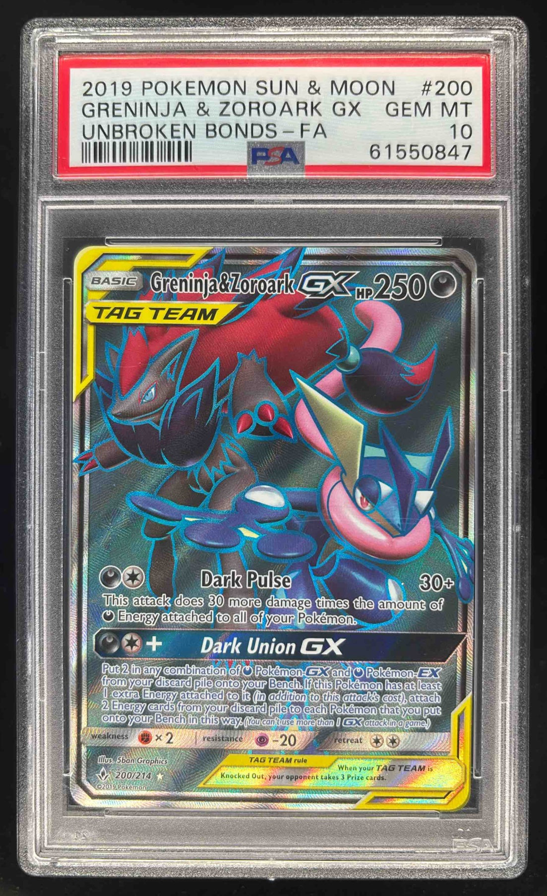 2019 Pokemon Sun & Moon Unbroken Bonds #200 Greninja & Zoroark Tag Team PSA 10