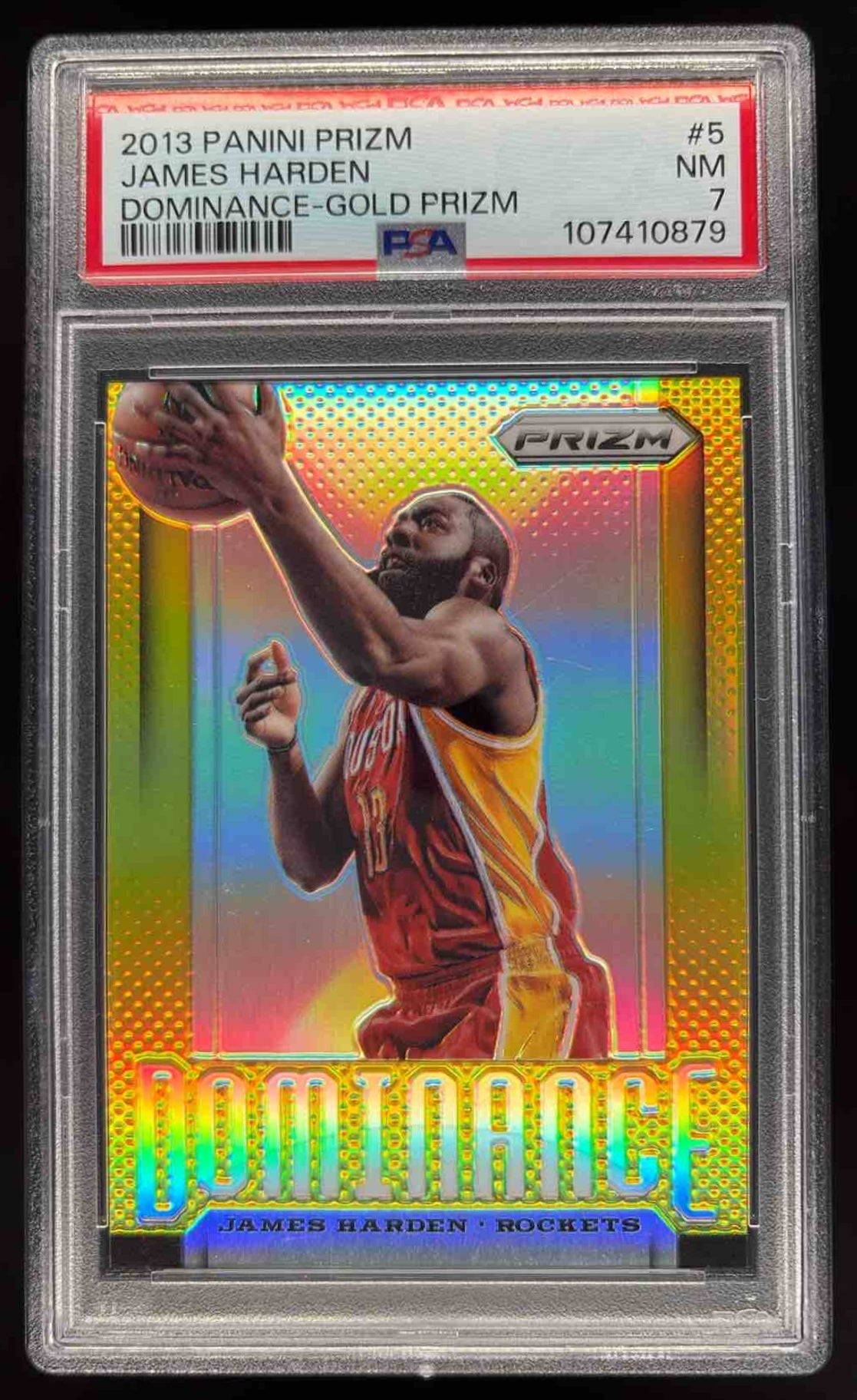2013-14 Panini Prizm Dominance Prizms Gold #5 James Harden /10 PSA 7