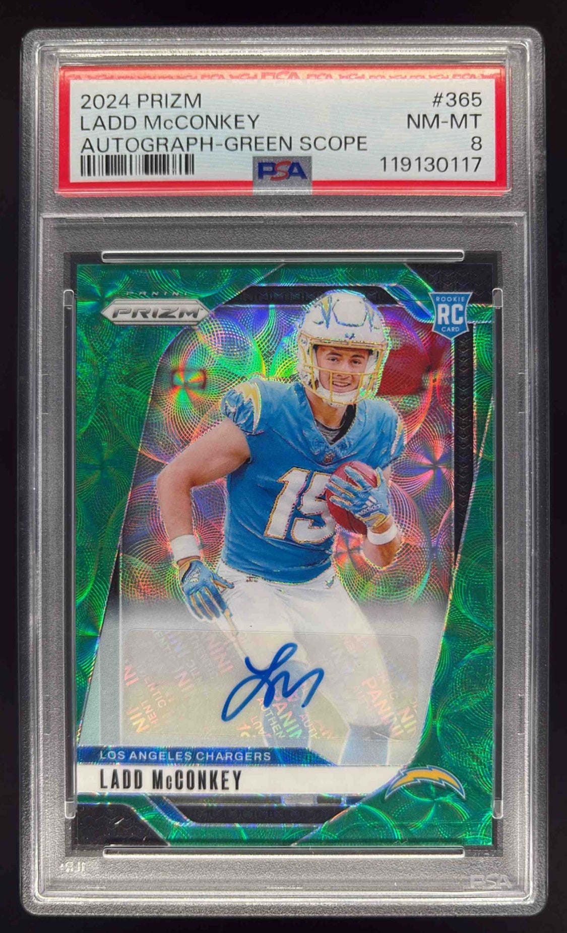 2024 Panini Prizm Autographs Green Scope #365 Ladd McConkey RC Auto /75 PSA 8