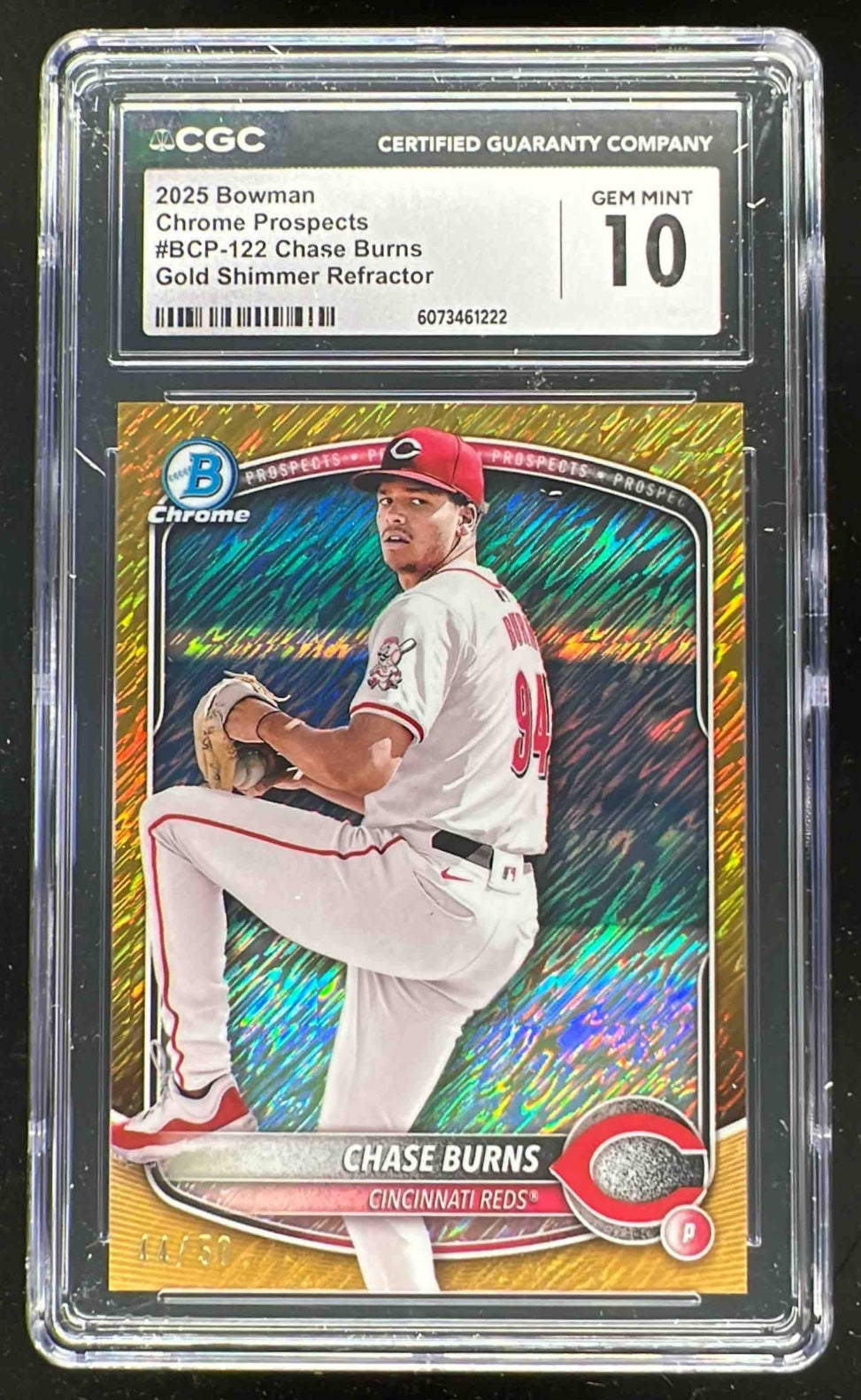 2025 Bowman Chrome Prospects Gold Shimmer Refractor #122 Chase Burns /50 CGC 10
