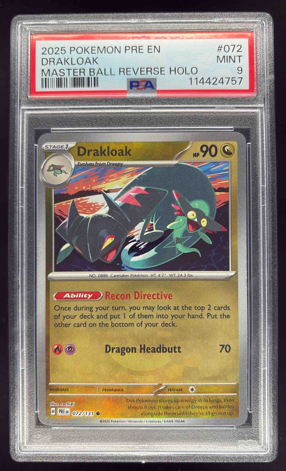 2025 Pokemon SV Prismatic Evolutions Reverse Holo Master Ball Drakloak PSA 9