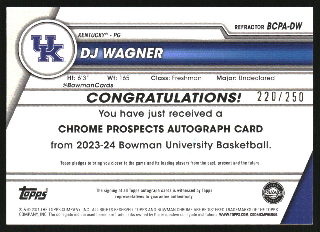 2023 Bowman Chrome University Autograph Refractor DJ Wagner RC Auto /250