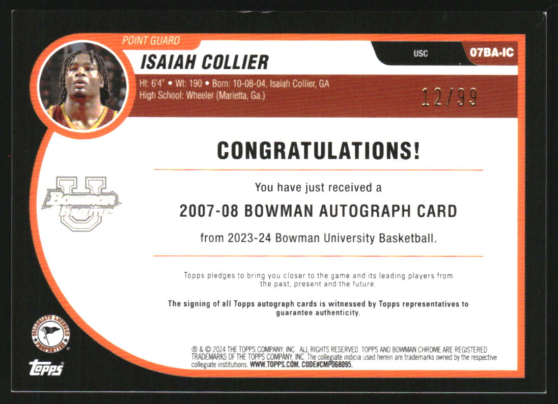 2023-24 Bowman Chrome University '07-08 Bowman Auto #07BAIC Isaiah Collier /99