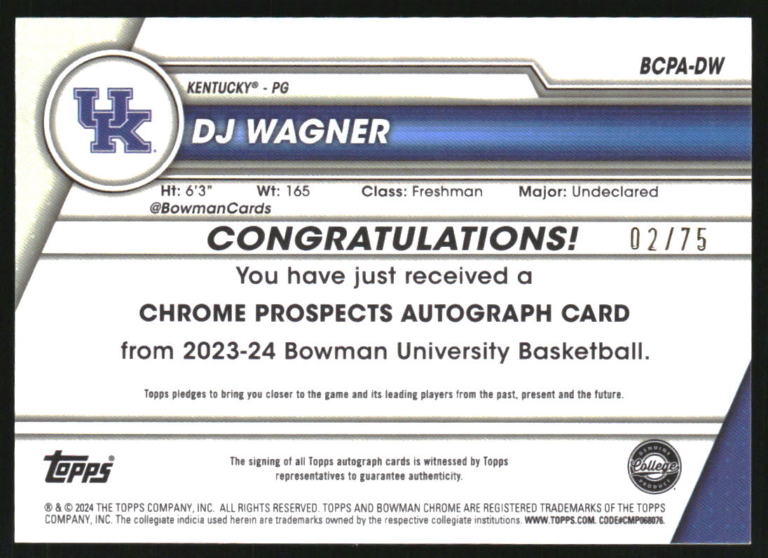 2023-24 Bowman Chrome University Prospect Autograph Yellow DJ Wagner RC Auto /75