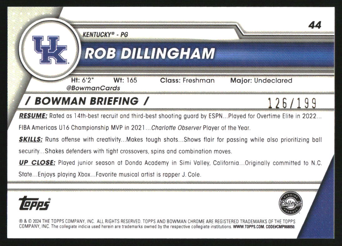 2023-24 Bowman Chrome University Blue Refractors #44 Rob Dillingham RC /199
