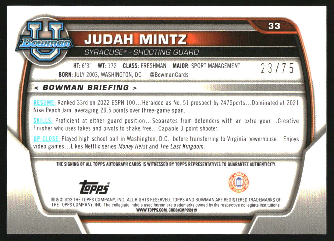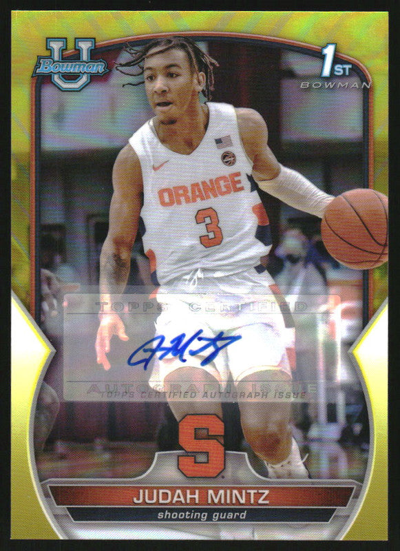 2022 Bowman Chrome University Prospect Autograph Yellow Judah Mintz RC Auto /75