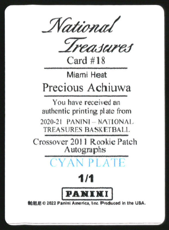 2020 National Treasures Printing Plate Cyan Precious Achiuwa RC 1/1