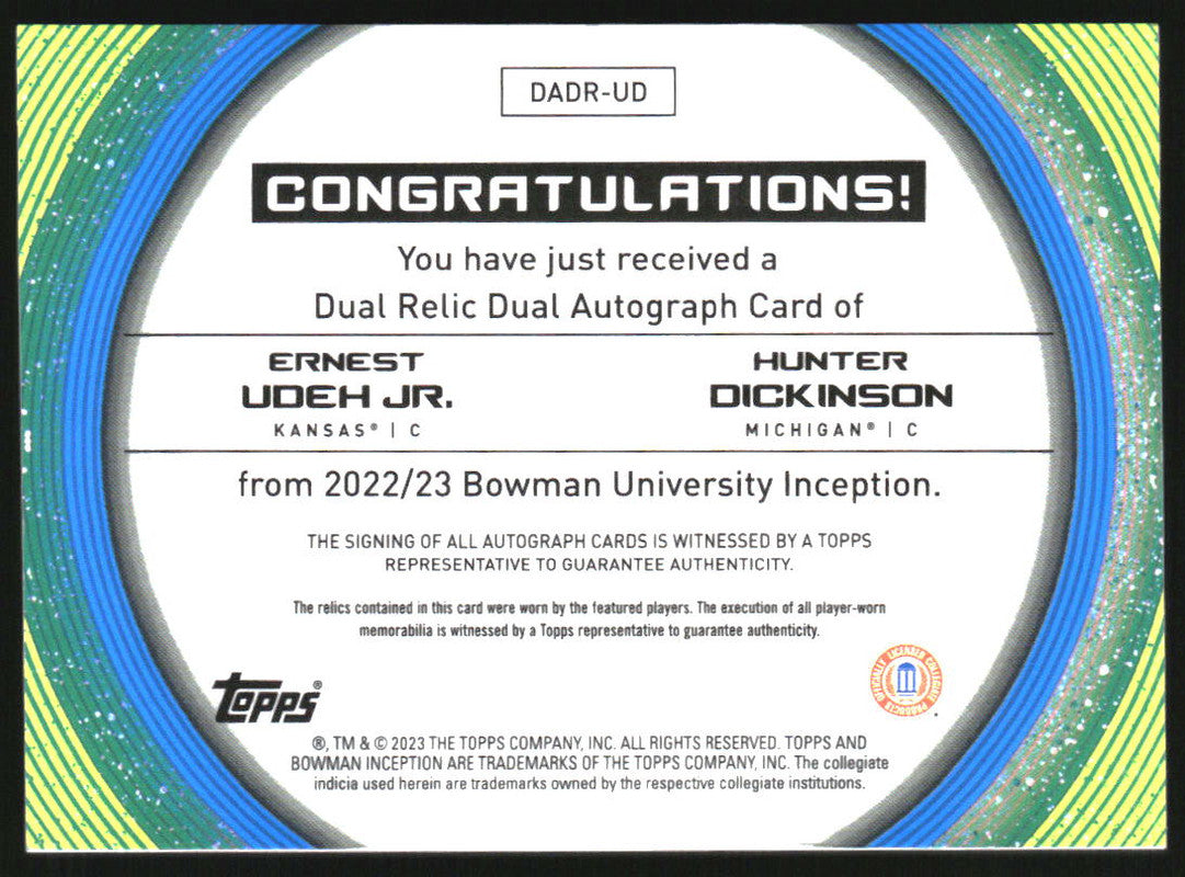 2022 Bowman Inception University Dual Auto Ernest Udeh Jr. Hunter Dickinson /99