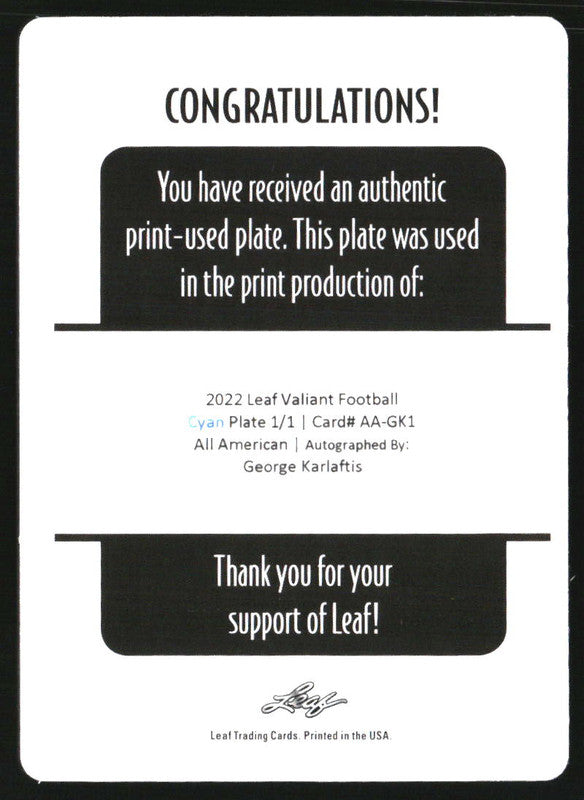 2022 Leaf Valiant All American Plate Cyan Auto George Karlaftis 1/1