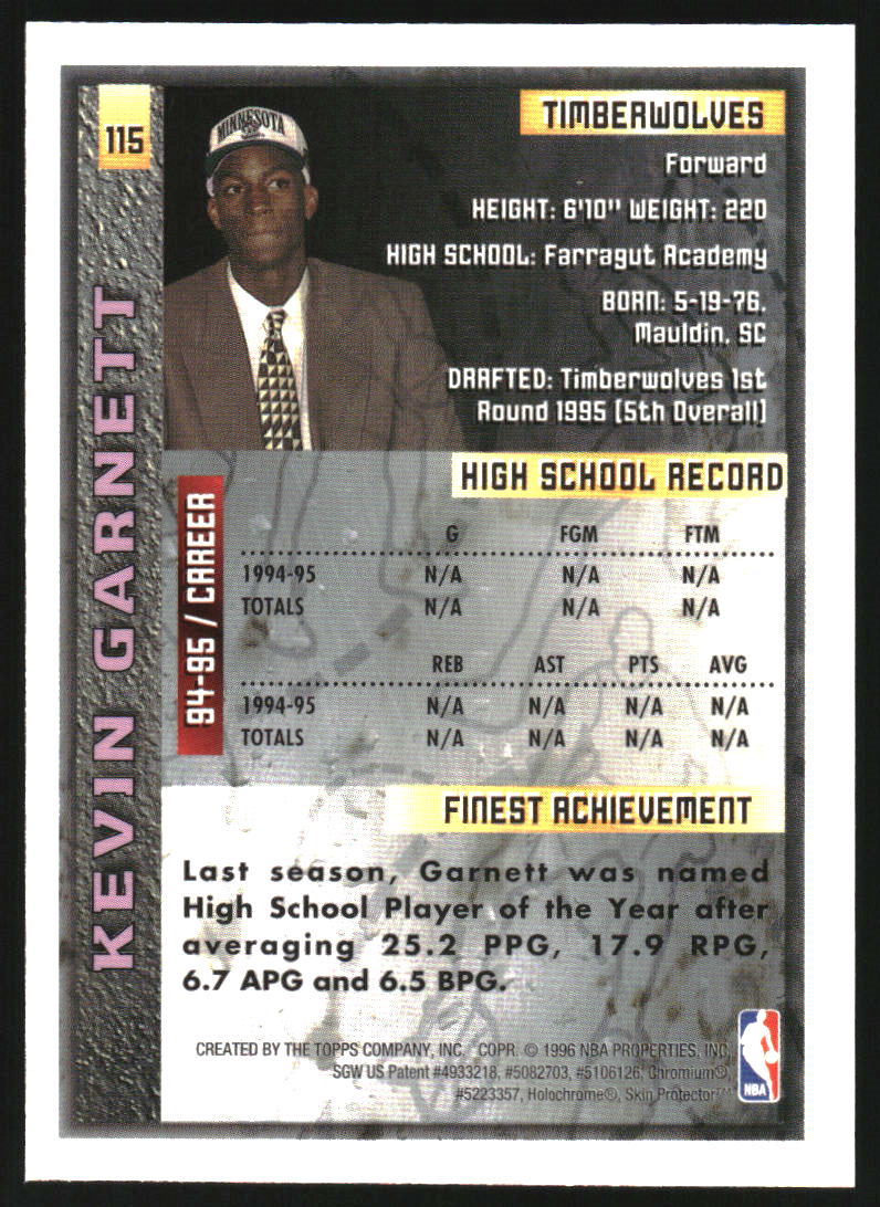 1995-96 Finest #115 Kevin Garnett RC Rookie