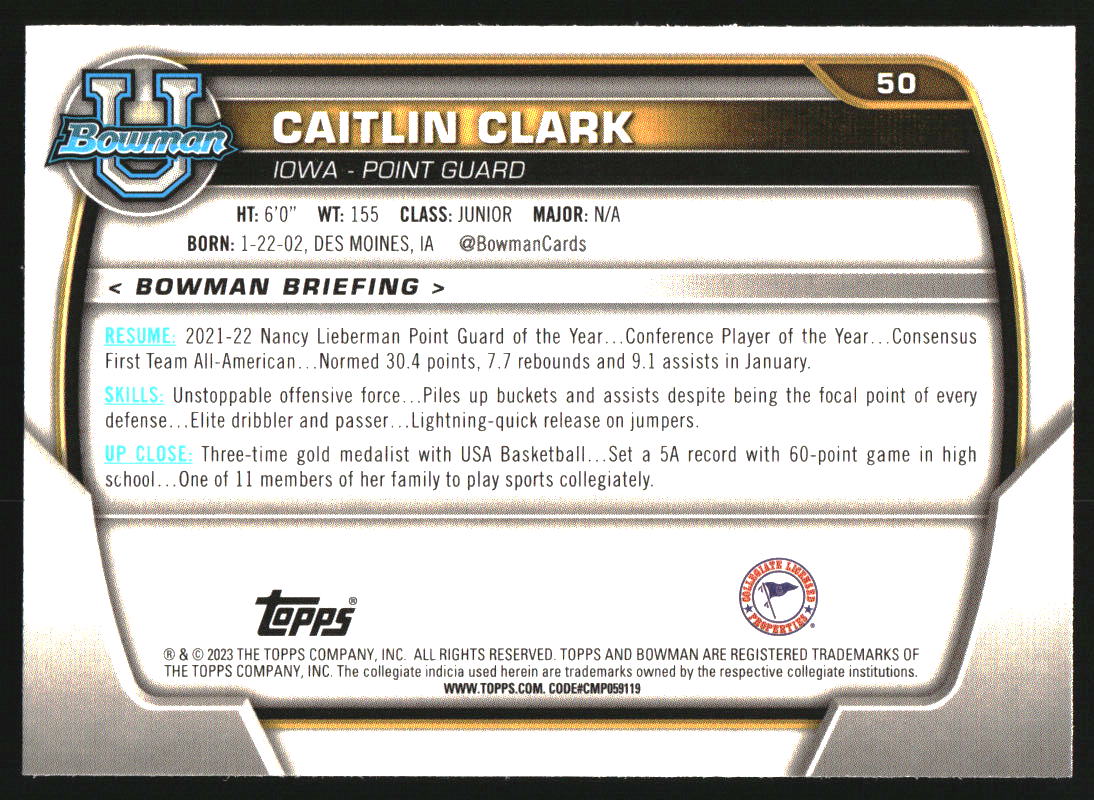 2022-23 Bowman Chrome University #50 Caitlin Clark RC Rookie