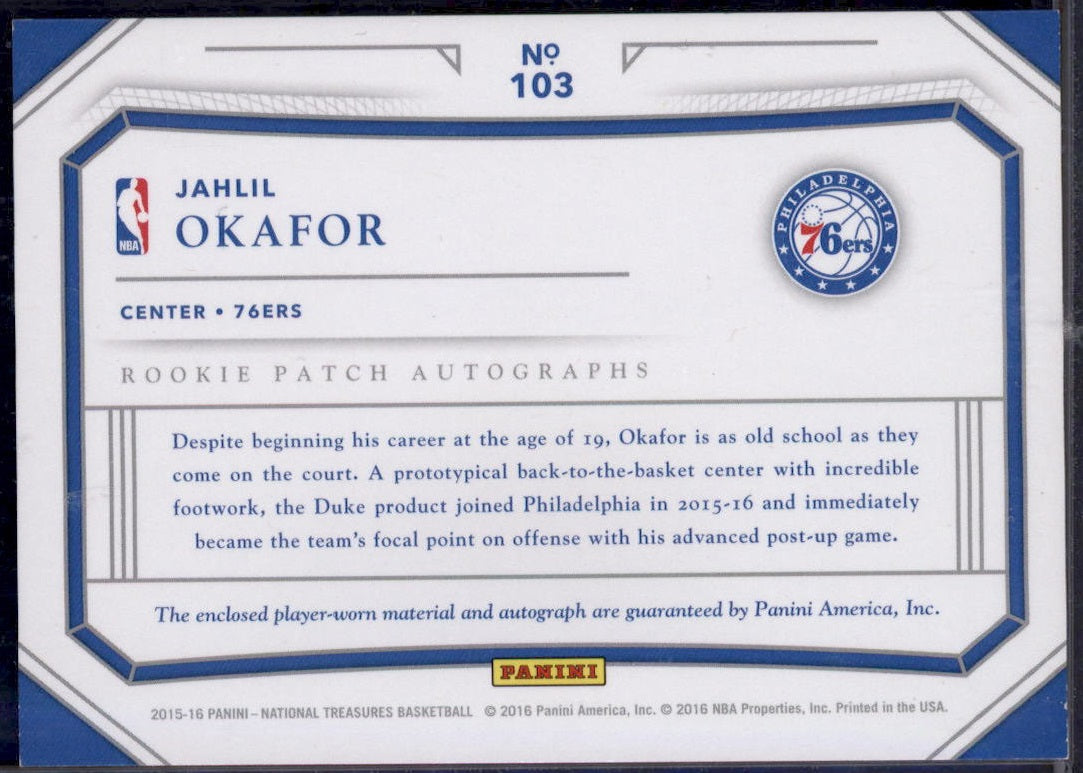 2015-16 Panini National Treasures Silver #103 Jahlil Okafor RC Jersey Auto /25