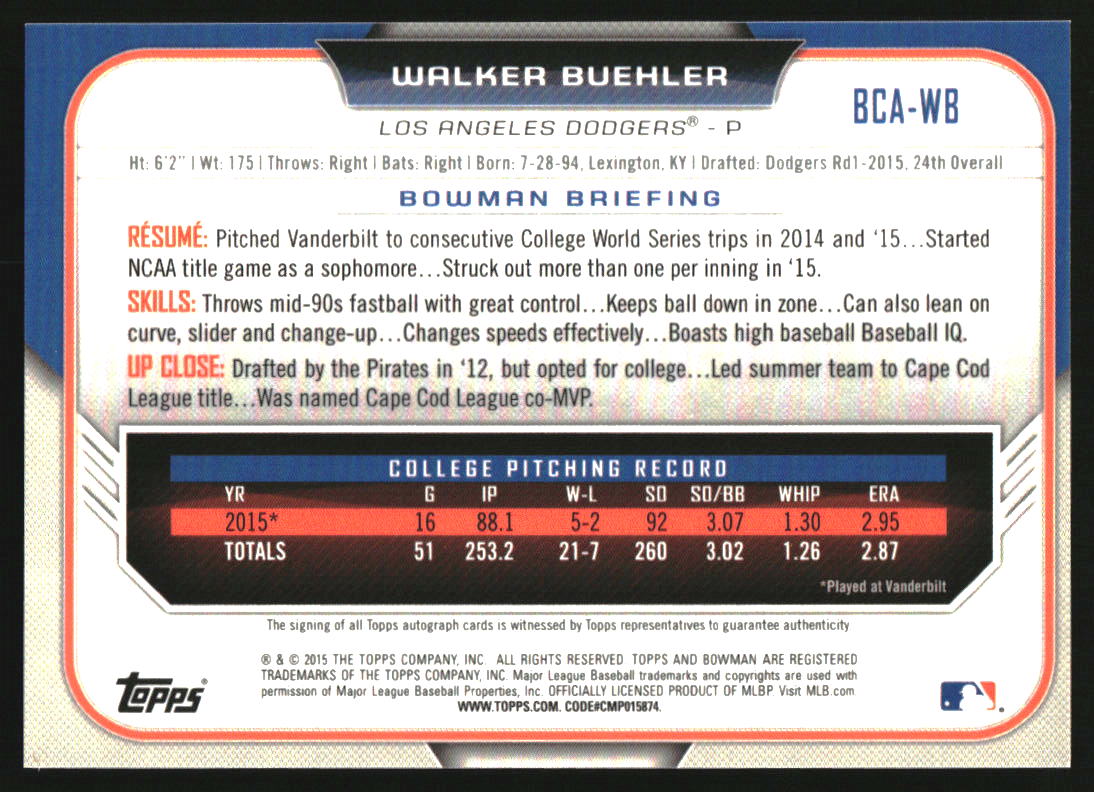2015 Bowman Draft Chrome Pick Autographs #BCA-WB Walker Buehler RC Auto