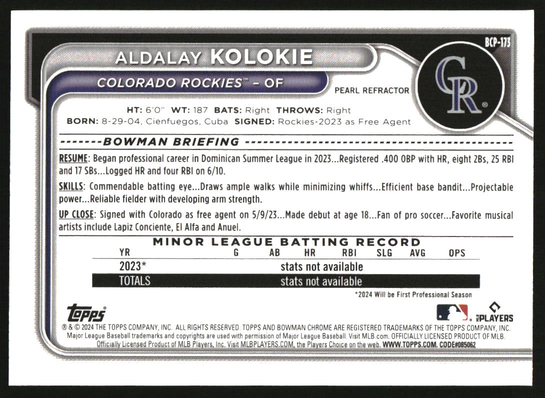 2024 Bowman Chrome Chrome Pearl Refractor #BCP-173 Aldalay Kolokie RC