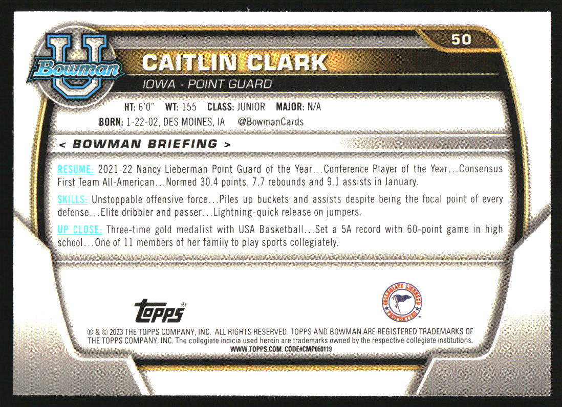 2022-23 Bowman Chrome University #50 Caitlin Clark RC
