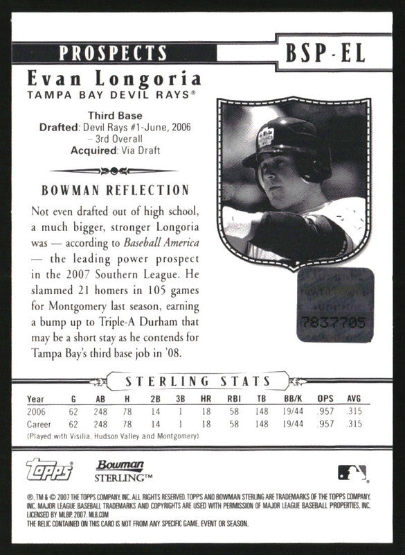 2007 Bowman Sterling Prospects #BSP-EL Evan Longoria Autograph Auto