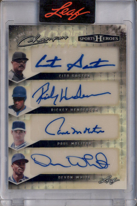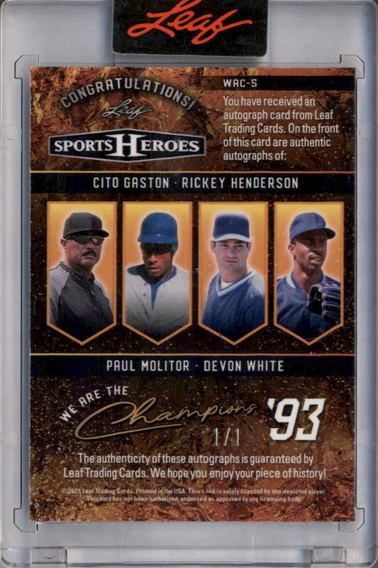 2025 Leaf Champions Gold Cito Gaston Rickey Henderson Molitor White Auto 1/1
