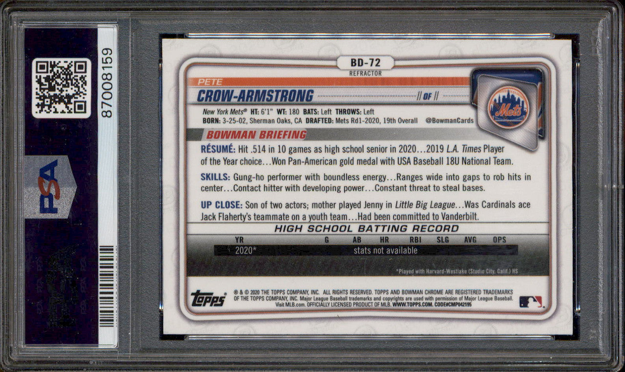 2020 Bowman Draft Chrome Refractor #BD72 P.Crow-Armstrong RC PSA 10
