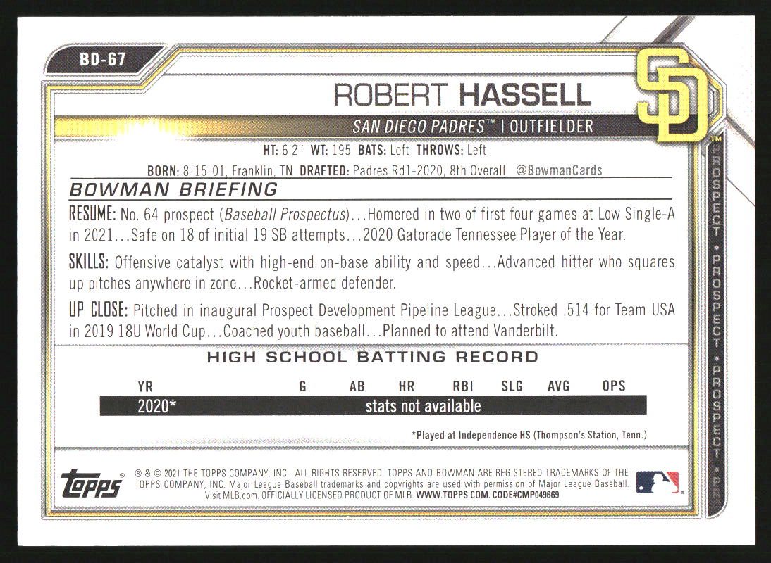 2021 Bowman Draft Red #BD-67 Robert Hassell /5
