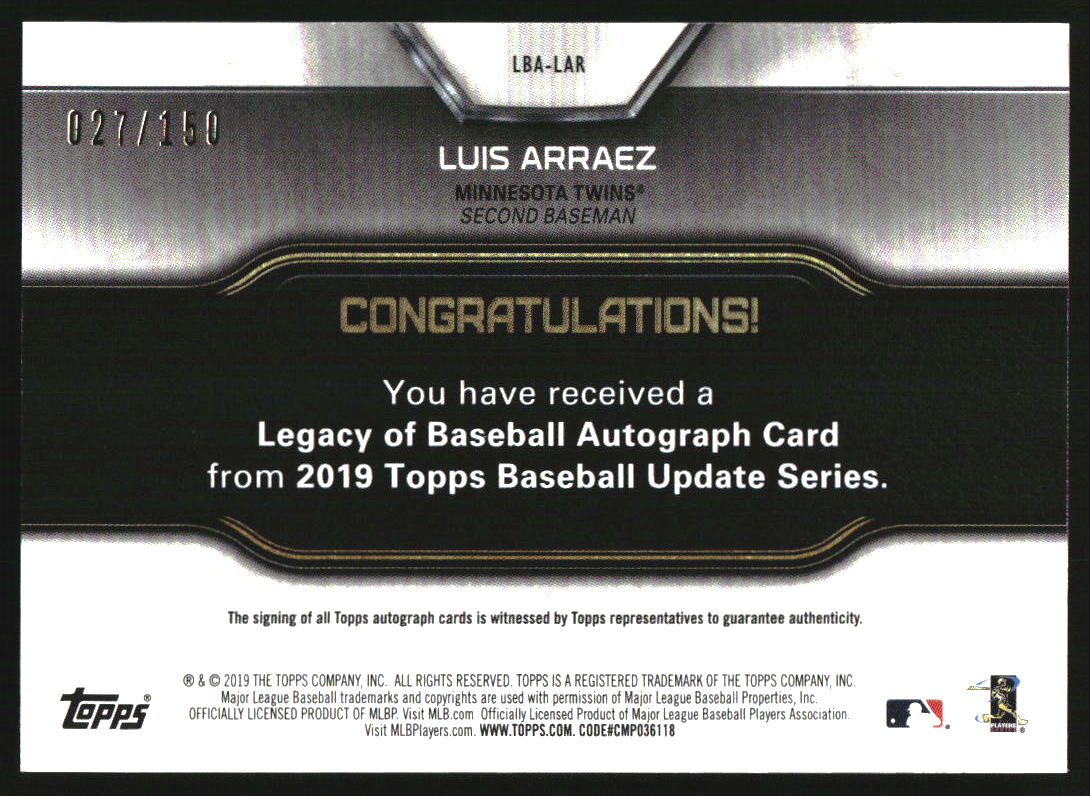 2019 Topps Update Legacy of Baseball 150th Anniversary Luis Arraez RC Auto /150