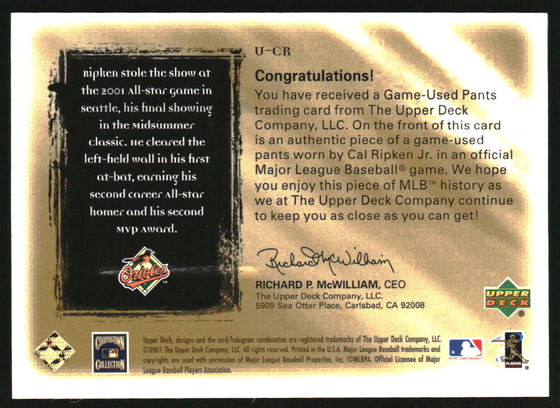 2001 Upper Deck Ultimate Collection Game Jersey Gold #UCR Cal Ripken Jr. /15