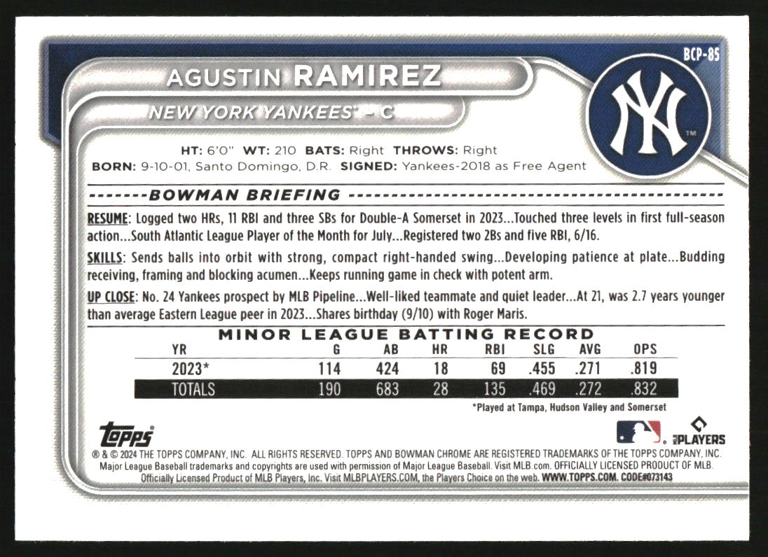 2024 Bowman Sapphire Chrome Gold Sapphire #BCP-85 Agustin Ramirez RC /50