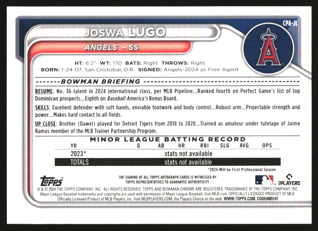 2024 Bowman Chrome Autographs Green Refractor #CPA-JL Joswa Lugo RC Auto /99