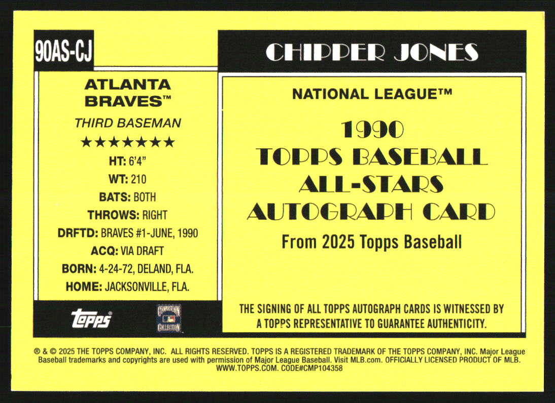 2025 Topps 1990 All-Star Autographs Orange #90AS-CJ Chipper Jones Auto /25