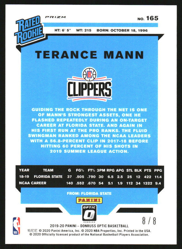 2019-20 Panini Donruss Optic Choice Black Gold #165 Terance Mann RC /8