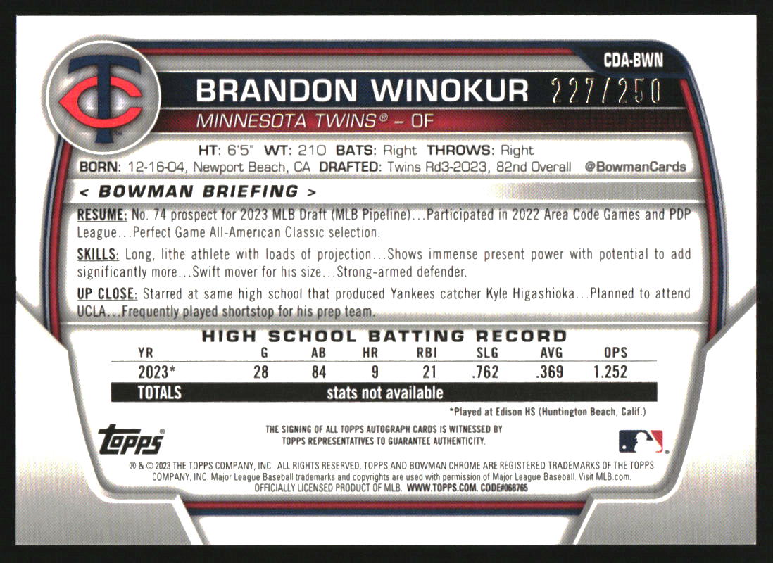 2023 Bowman Draft Chrome Autographs Purple Brandon Winokur RC Auto /250