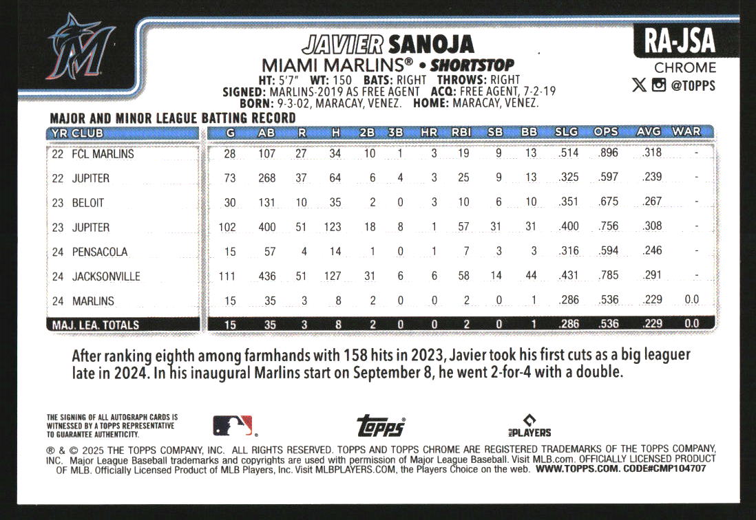 2025 Topps Chrome Rookie Autographs Blue #RA-JSA Javier Sanoja RC Auto /150