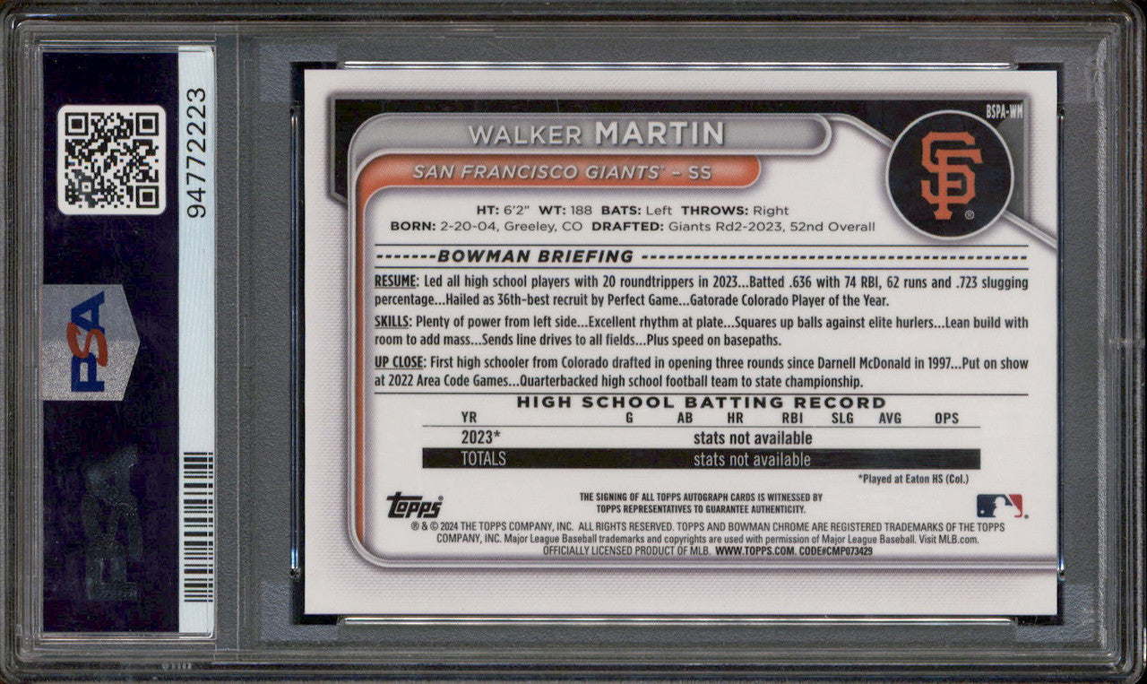 2024 Bowman Chrome Sapphire Auto Orange #WM Walker Martin RC /25 PSA 10