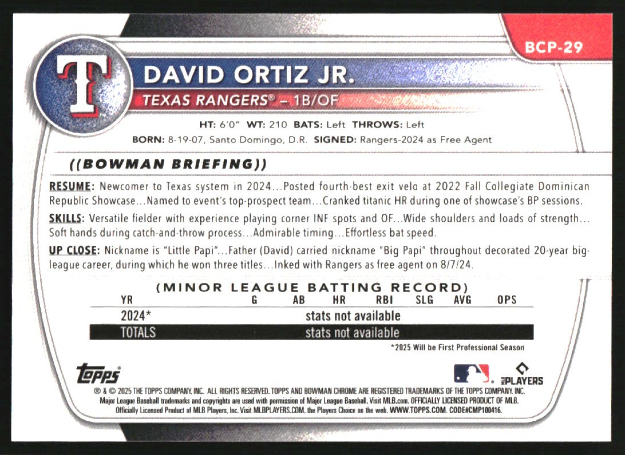 2025 Bowman Chrome Prospects Rose Gold Refractors #BCP29 David Ortiz Jr. RC /15