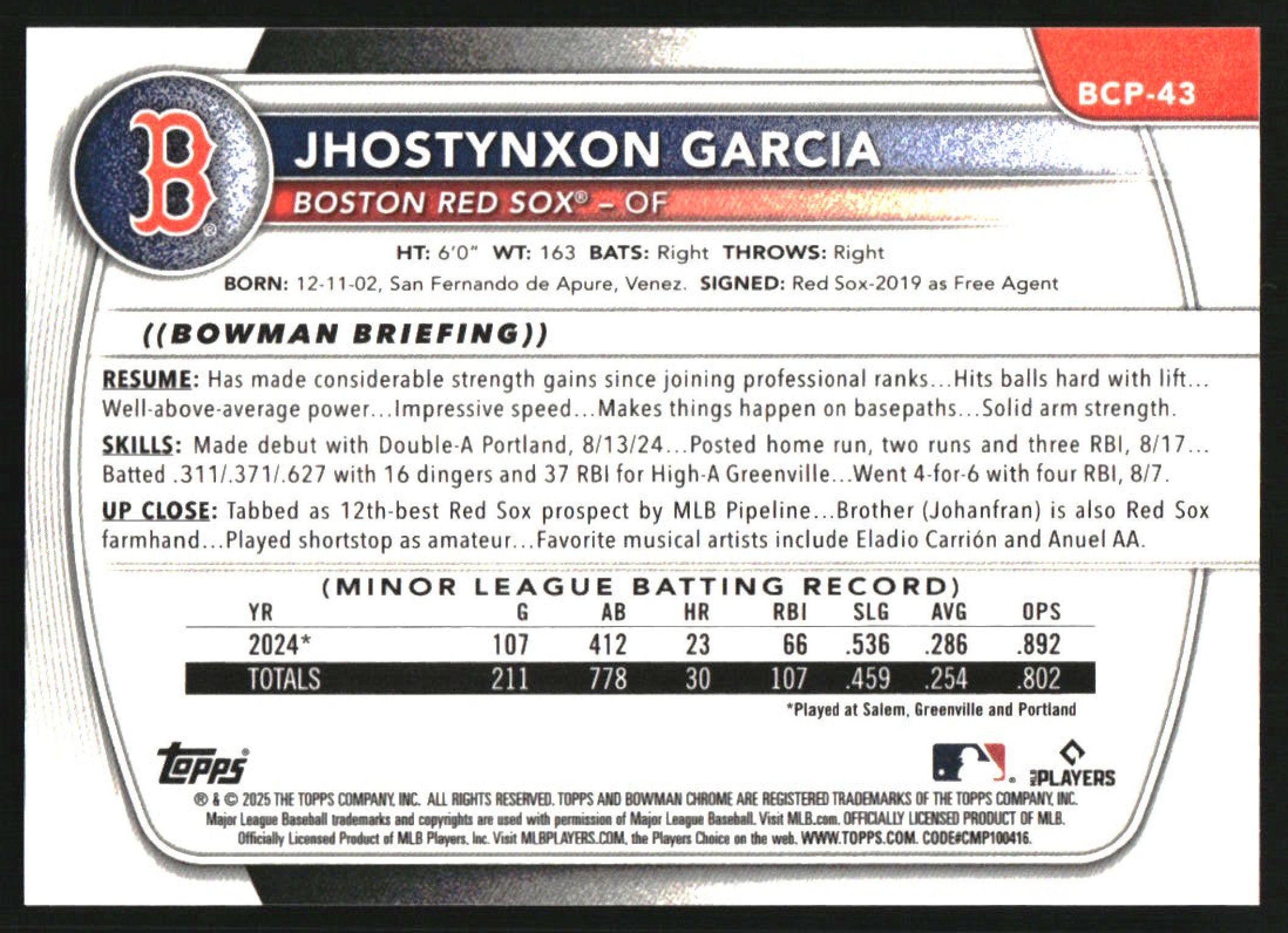 2025 Bowman Chrome Prospects Orange Refractor #BCP-43 Jhostynxon Garcia RC /25