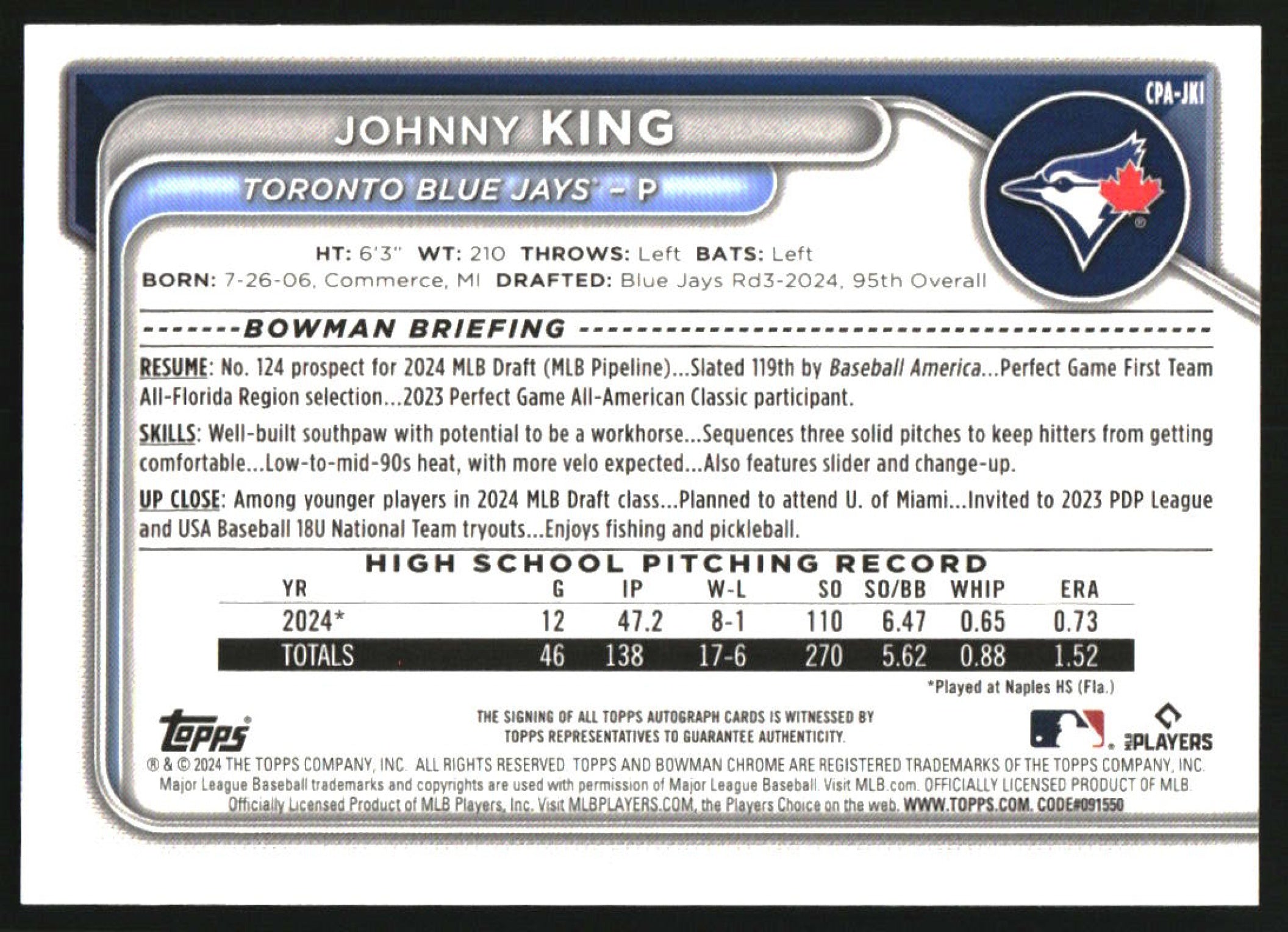 2024 Bowman Chrome Autographs Green Refractor #CPA-JKI Johnny King RC Auto /99