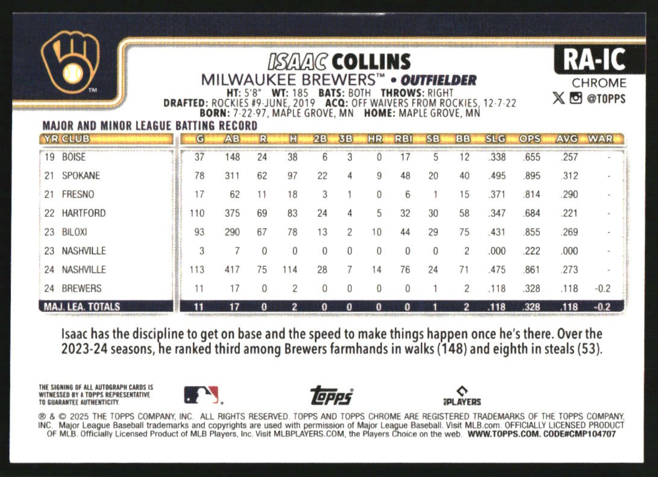 2025 Topps Chrome Rookie Autographs #RA-IC Isaac Collins RC Auto
