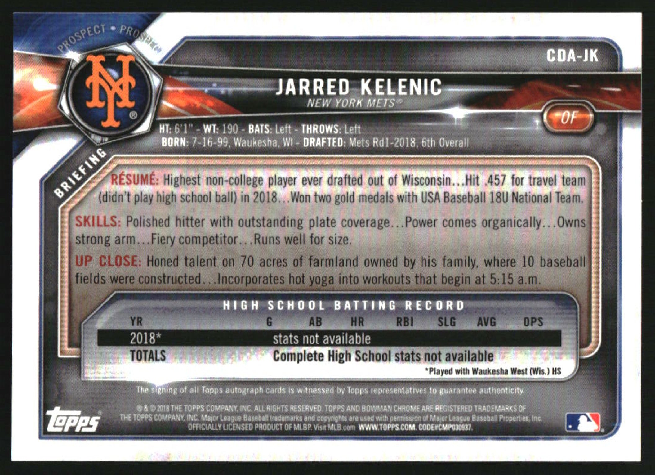 2018 Bowman Chrome Pick Blue Wave Refractor #CDA-JK Jarred Kelenic Auto /150