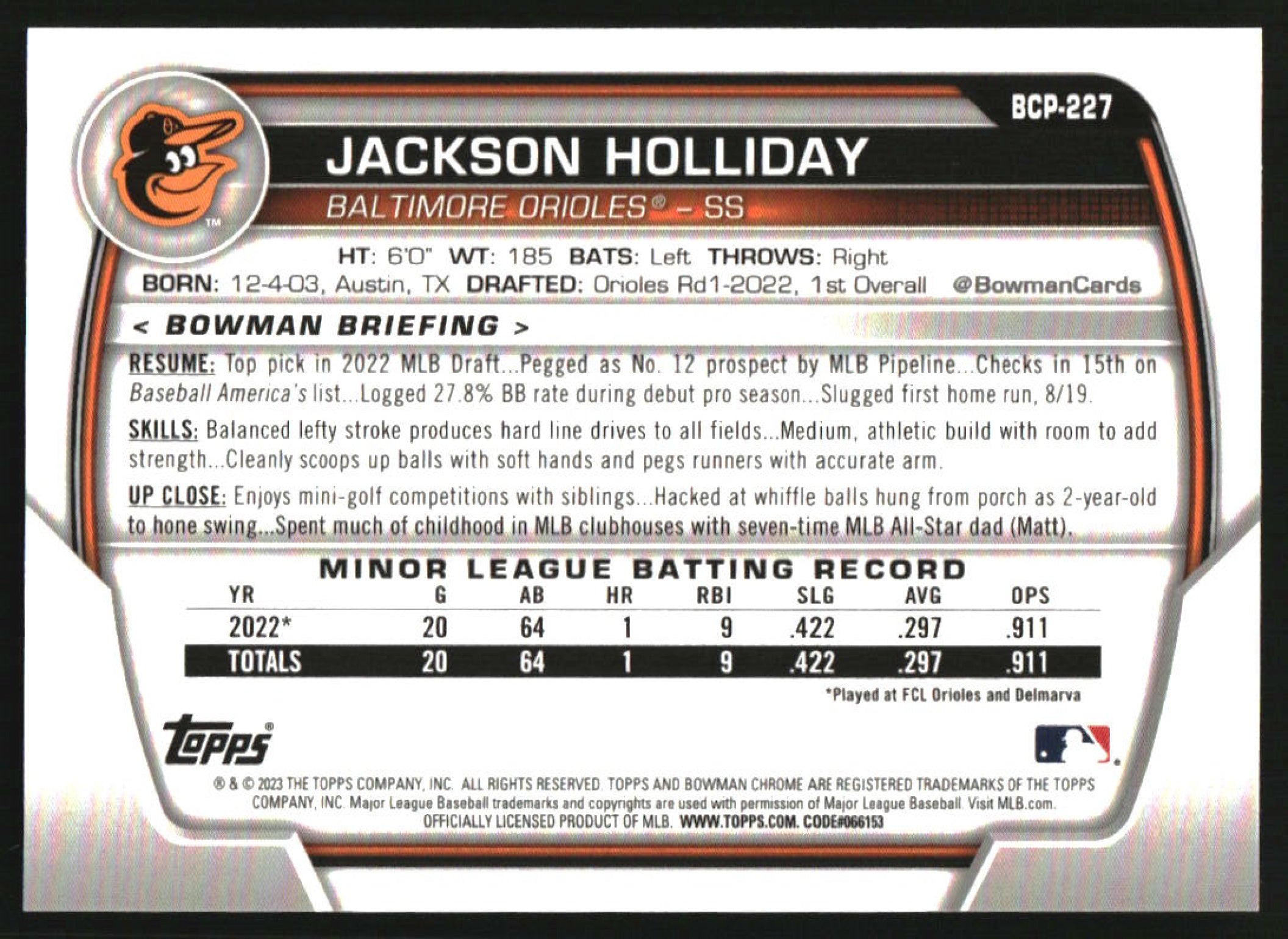 2023 Bowman Chrome Sapphire Chrome Prospects Aqua #BCP-227 Jackson Holliday /99
