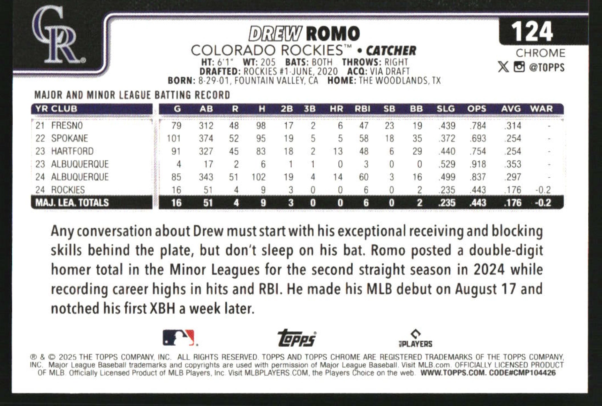 2025 Topps Chrome Black Lava Refractor #124 Drew Romo RC /10