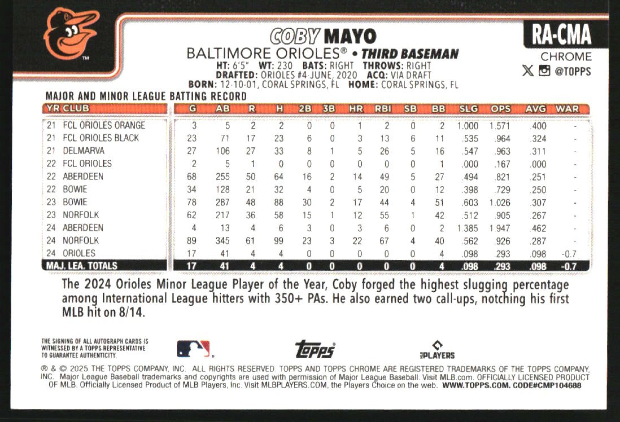 2025 Topps Chrome Rookie Autographs #RA-CMA Coby Mayo RC Auto