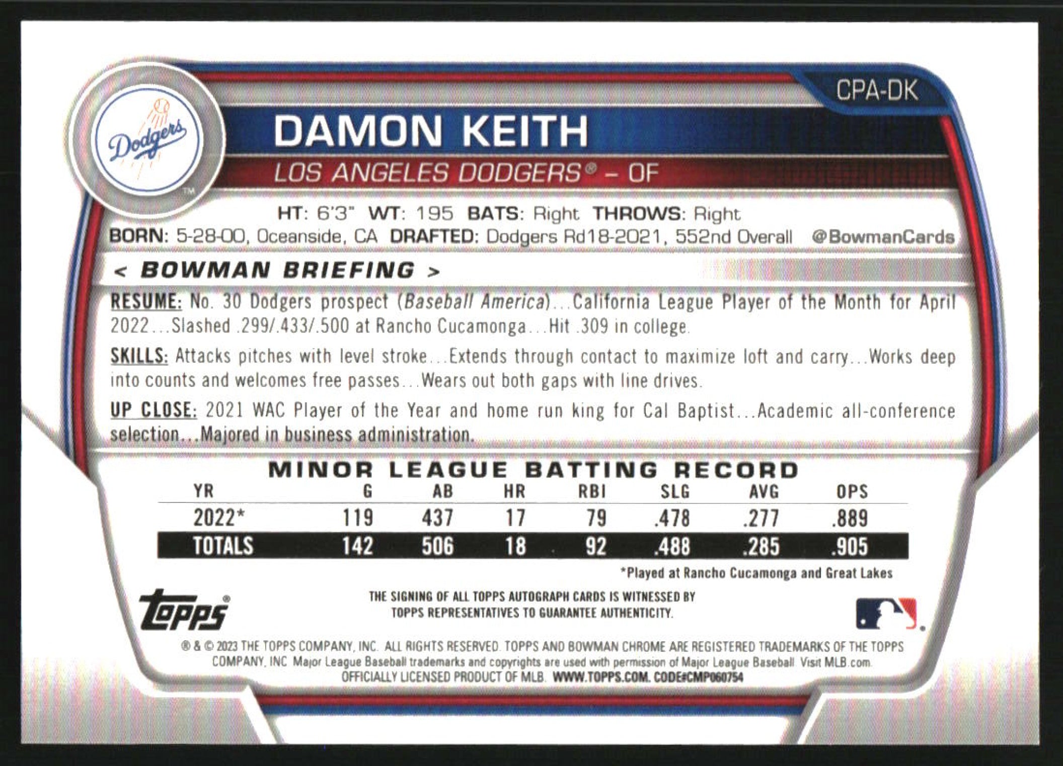 2023 Bowman Chrome Autographs Blue #CPA-DK Damon Keith RC Auto /150