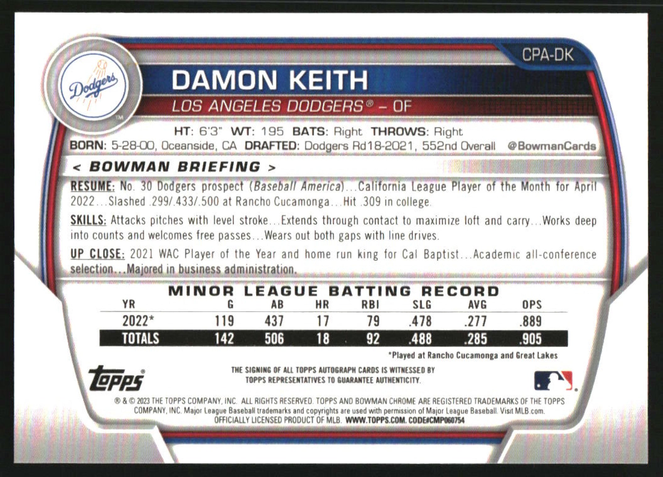 2023 Bowman Chrome Blue Refractor #CPA-DK Damon Keith RC Auto /150