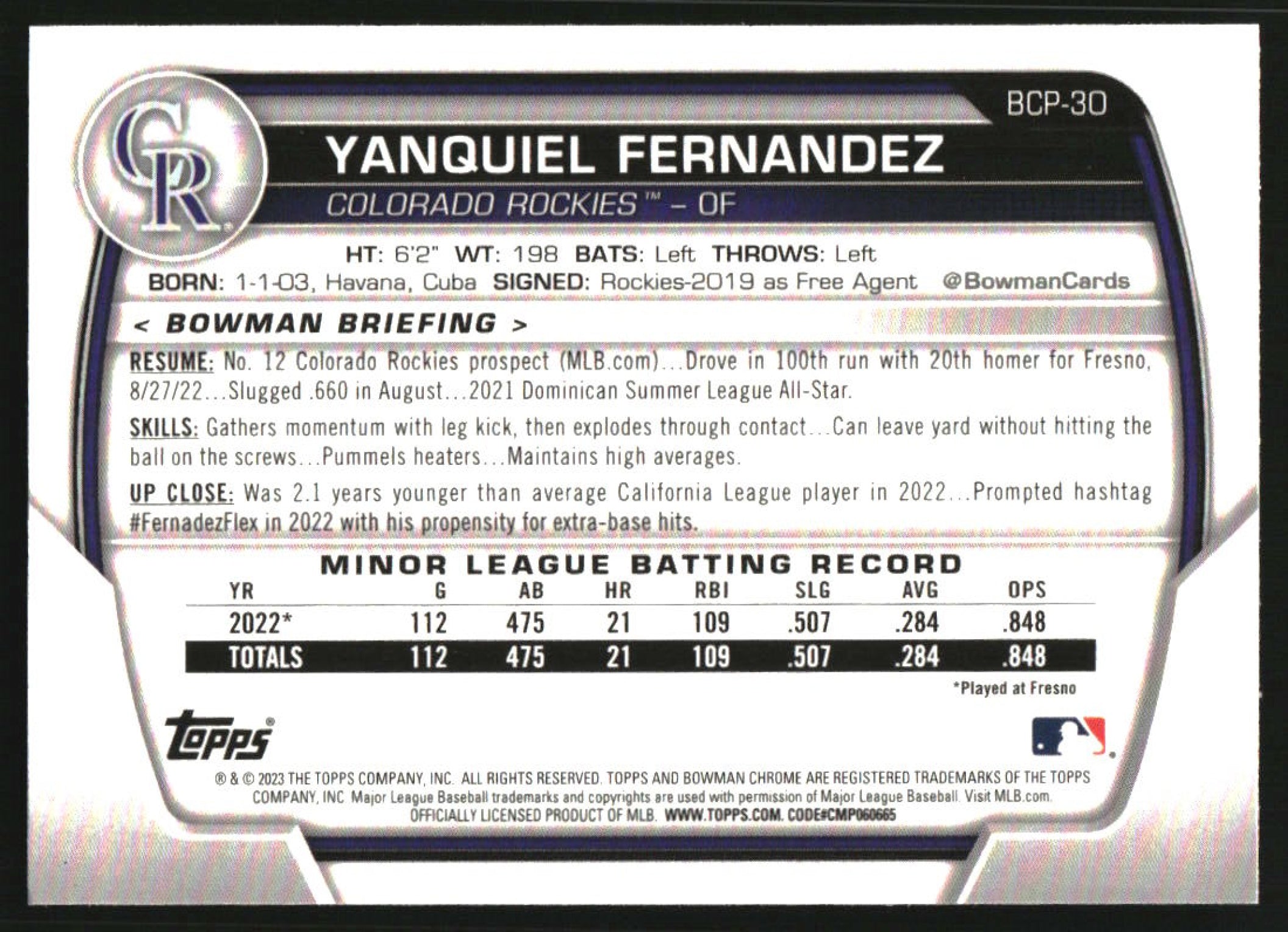 2023 Bowman Chrome Prospects Pearl Refractor #BCP-30 Yanquiel Fernandez