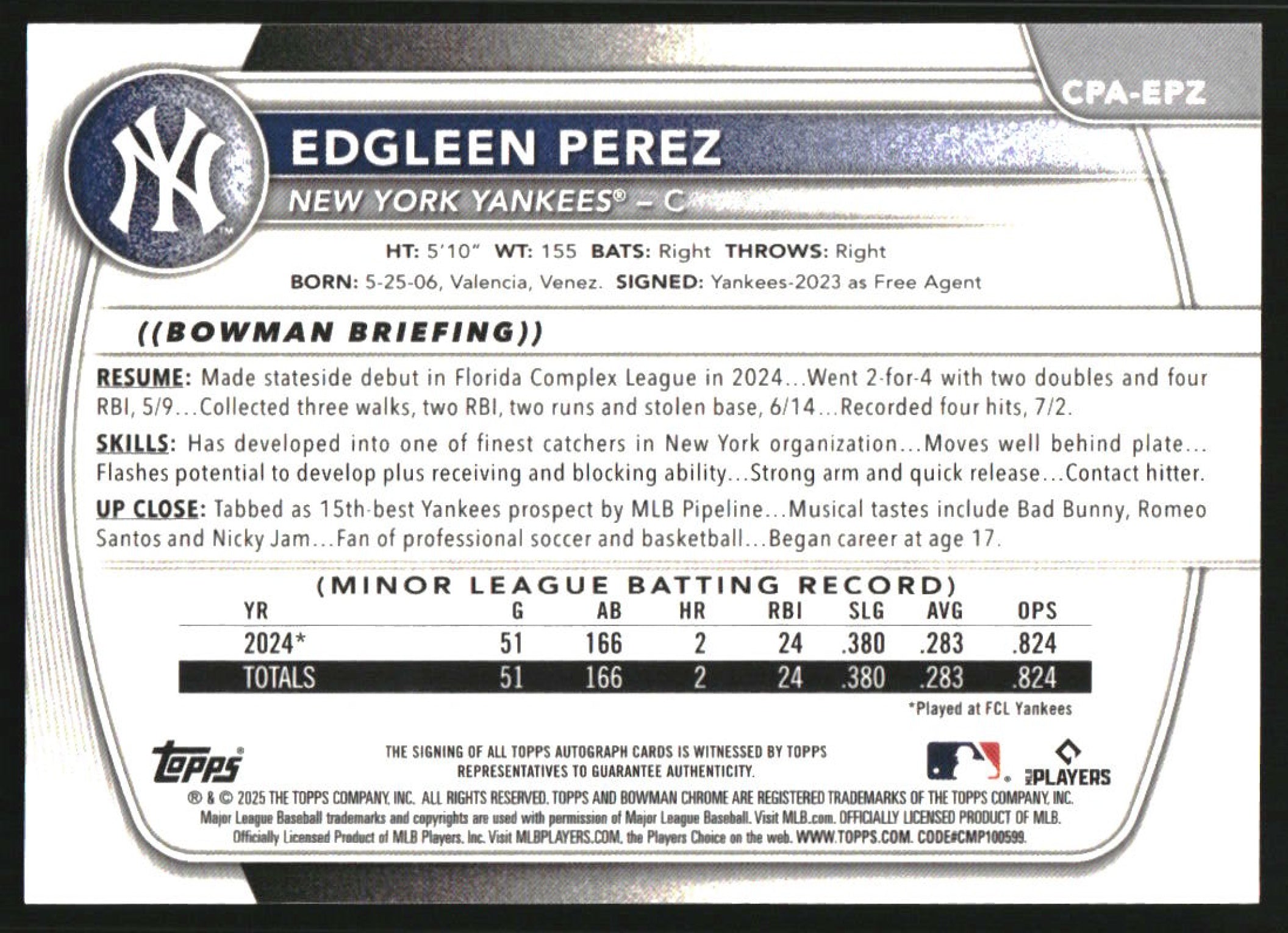 2025 Bowman Chrome Mini-Diamond Refractor #CPA-EPZ Edgleen Perez RC Auto /100