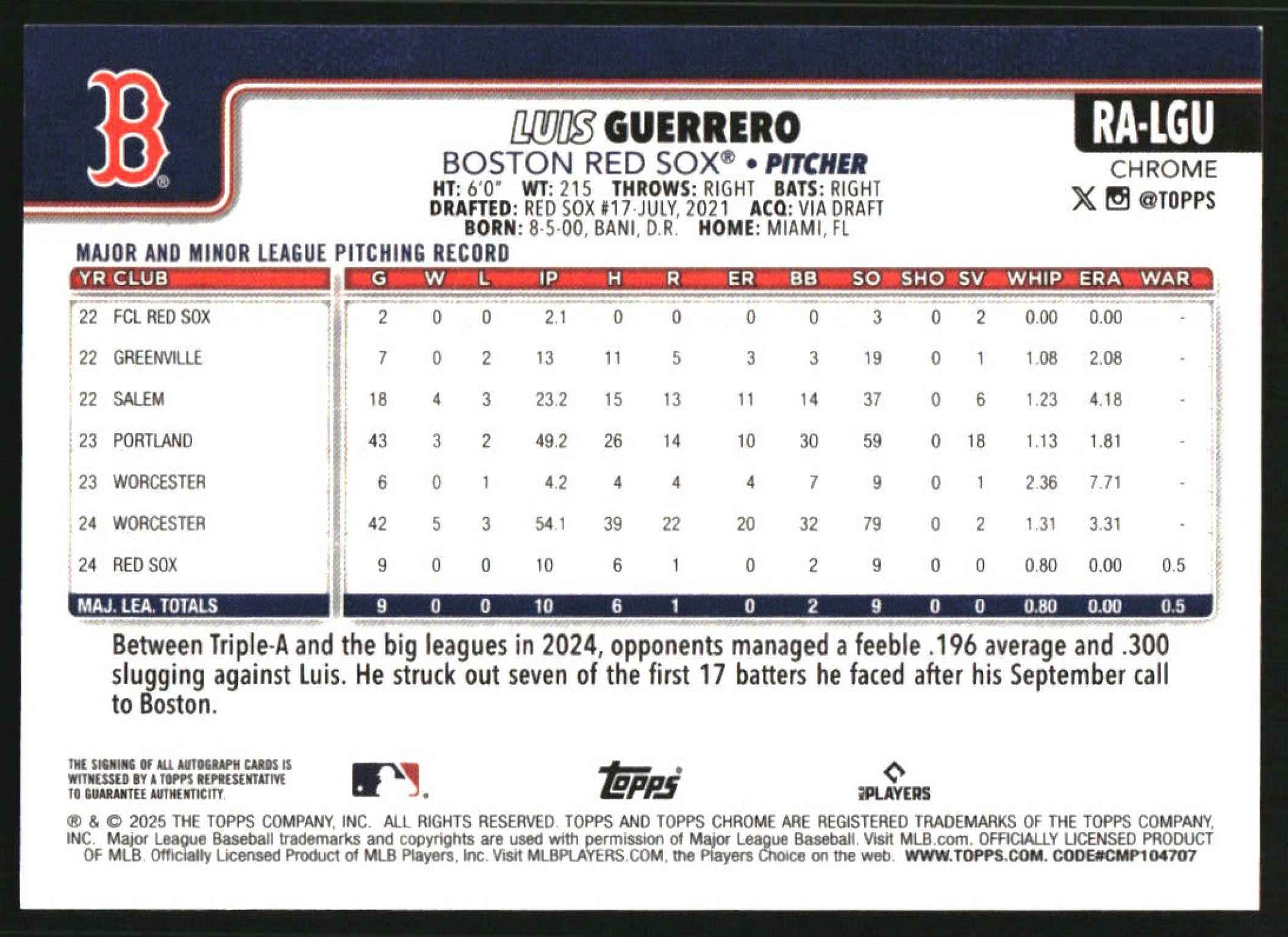 2025 Topps Chrome Rookie B&W Mini-Diamond #RA-LGU Luis Guerrero RC Auto