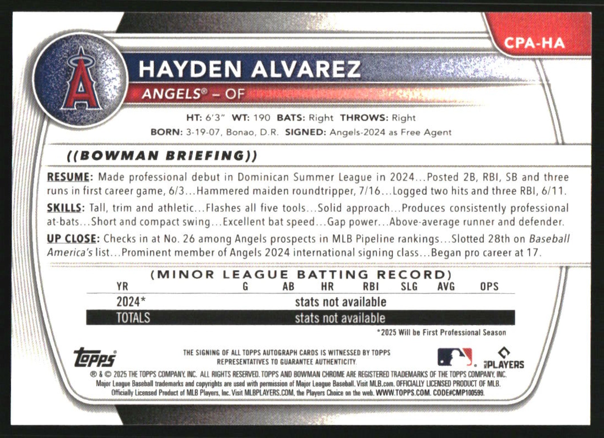 2025 Bowman Chrome Autographs #CPA-HA Hayden Alvarez RC Auto