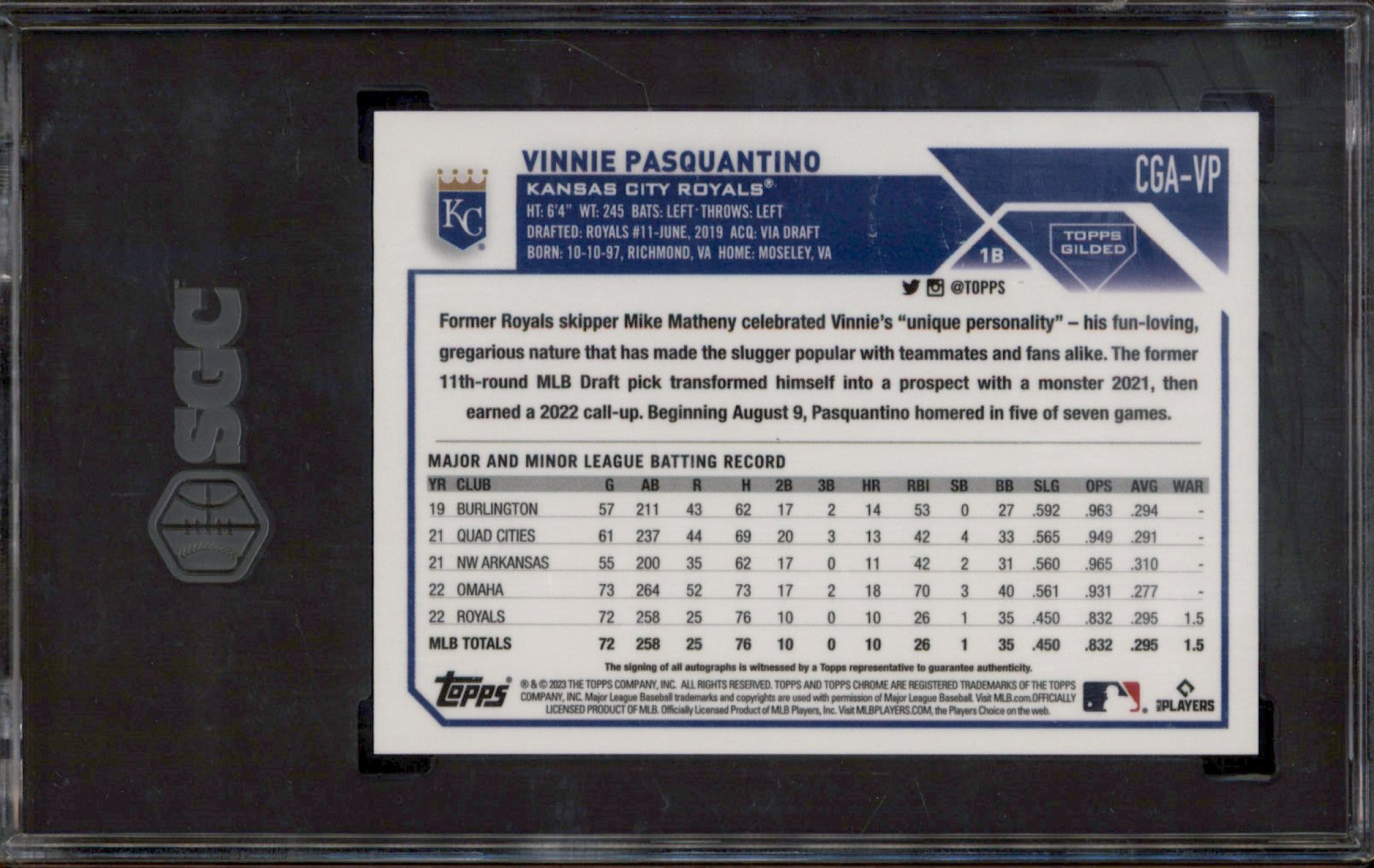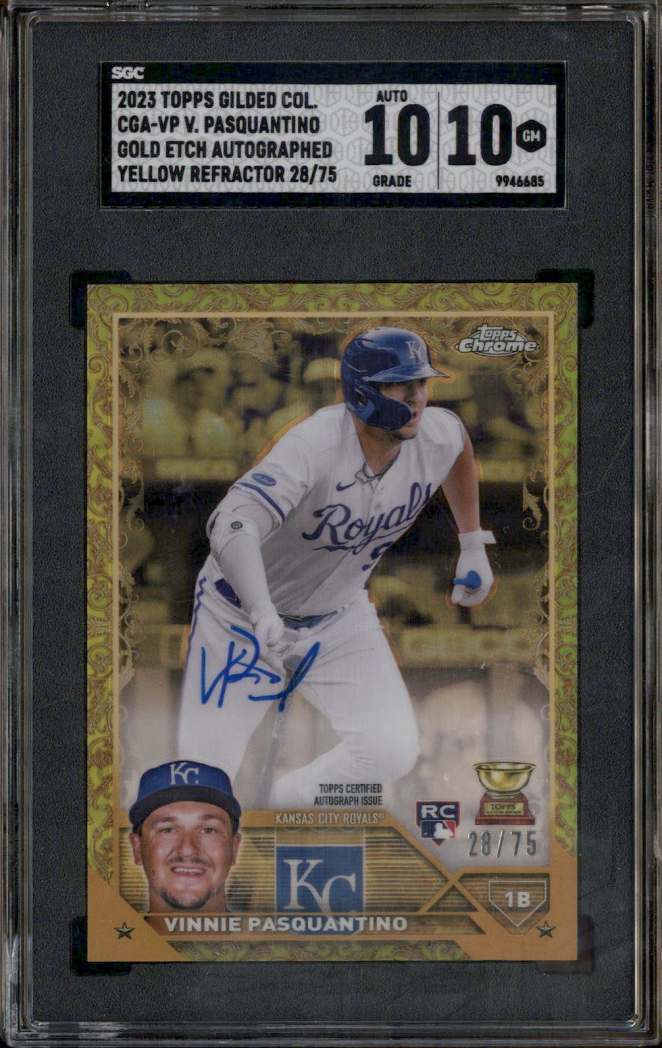 2023 Topps Gilded Chrome Gold Etch Yellow Vinnie Pasquantino RC Auto /75 SGC 10